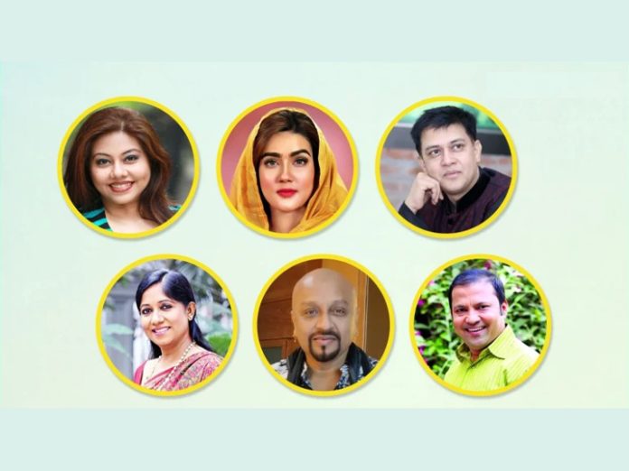 শমী কায়সার (ওপরের বাঁ থেকে), মাহিয়া মাহি, শাকিল খান, রোকেয়া প্রাচী, রুবেল ও সিদ্দিকুর রহমান।